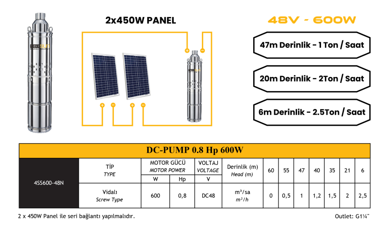 DC pompa 0,8Hp 600W (Screw Type) (4SS600-48N)